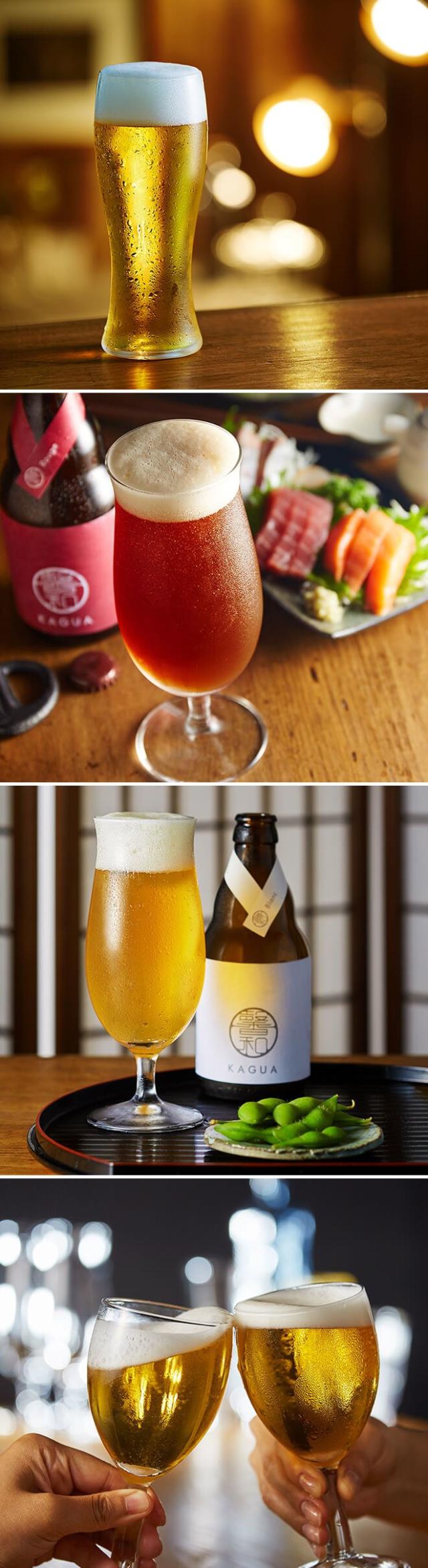 フルーティなエールタイプの香りの良さと、柚子や山椒のフレーバーが嫌みなく調和する洗練された味わい。アルコール度数はどちらのタイプも8、9度と高めに設定されていて、香りの高さと、料理の味を邪魔しないスッキリした後味を両立させている。赤ワイン、白ワインの感覚で、KAGUAを和食に合わせて選んで楽しんでいただきたい。