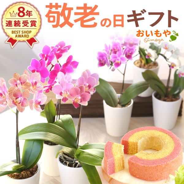 \遅れてごめんね/ 敬老の日 花 生花 お菓子 送料無料 選べる ミディ胡蝶蘭 蘭 鉢植え バウムクーヘン 2.5号鉢 産直 敬老の日 花 おいもや