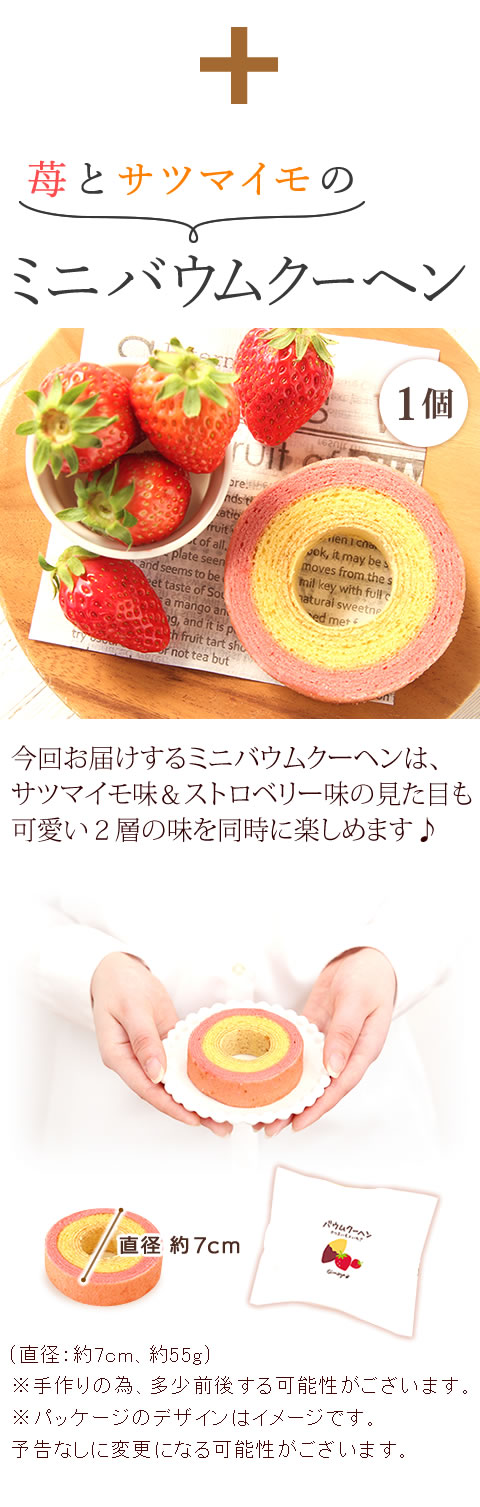 | 商品内容 | ○苺とサツマイモのバウムクーヘン [1個] ○マイクロ胡蝶蘭 [1鉢] |