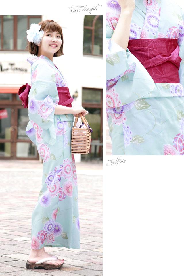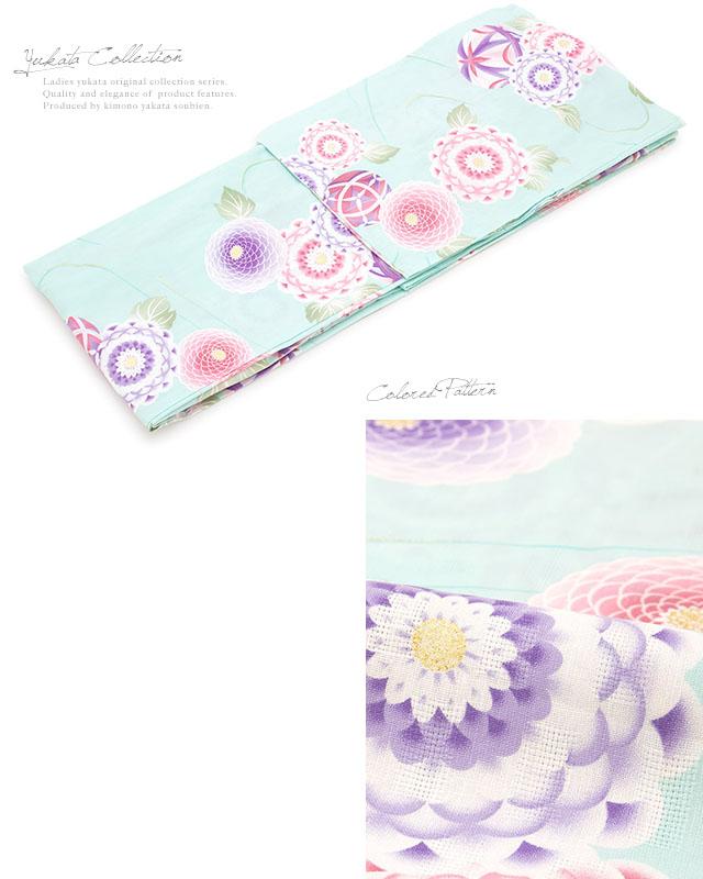 浴衣セット レディース レトロ 浴衣セット 大人 3点セット 水色 ブルー 紫系 ダリア ピンポンマム 花 手鞠 流水 ラメ 綿 半幅帯 女性 ボヌールセゾン フリー