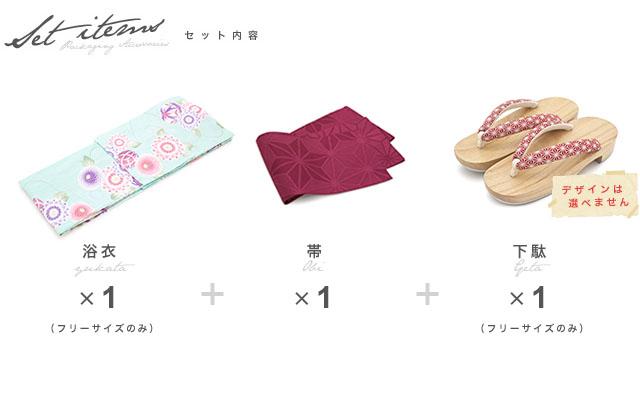 こちらの商品は、浴衣・帯・下駄の3点セットです。セット内容の一部変更や、それに伴う値引きは承っておりません。