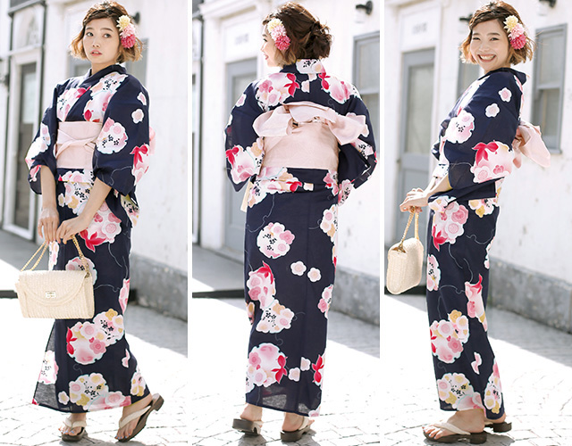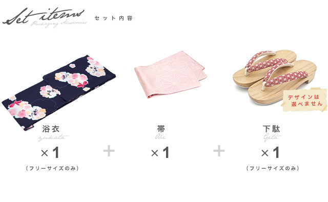 こちらの商品は、浴衣・帯・下駄の3点セットです。セット内容の一部変更や、それに伴う値引きは承っておりません。