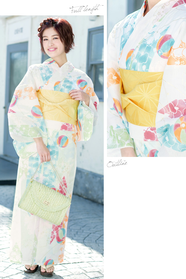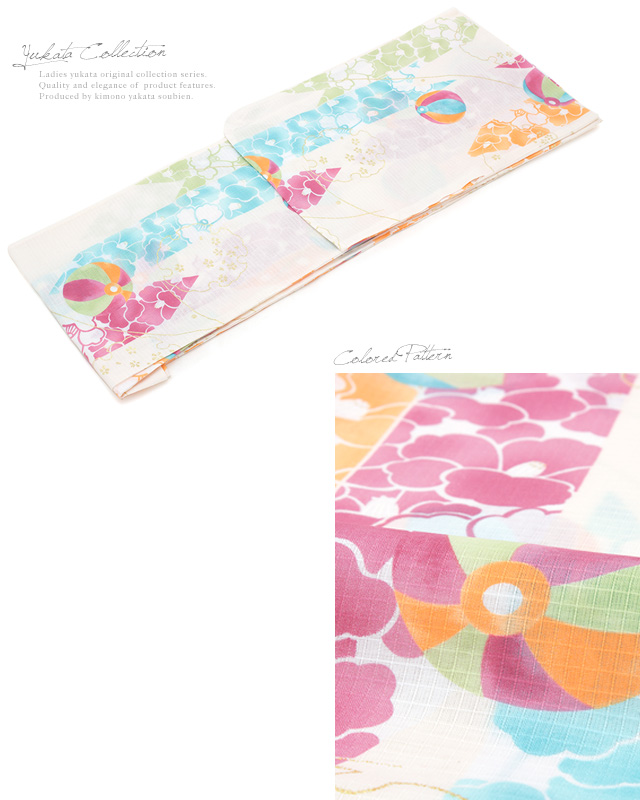浴衣セット レディース レトロ 浴衣セット 大人 3点セット 白系 ホワイト カラフル 黄色 雪輪 椿 紙風船 ラメ 綿 紅梅織 半幅帯 女性 ボヌールセゾン フリー