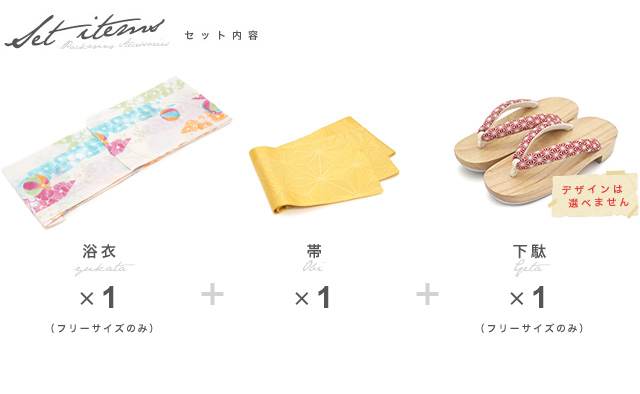 こちらの商品は、浴衣・帯・下駄の3点セットです。セット内容の一部変更や、それに伴う値引きは承っておりません。