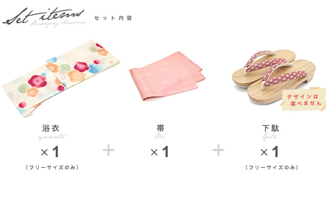 こちらの商品は、浴衣・帯・下駄の3点セットです。セット内容の一部変更や、それに伴う値引きは承っておりません。
