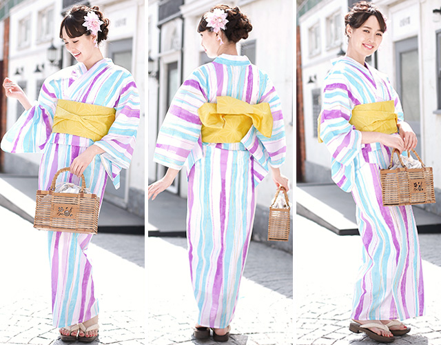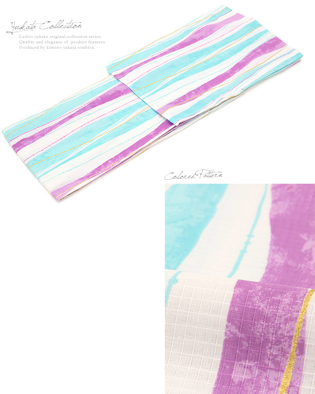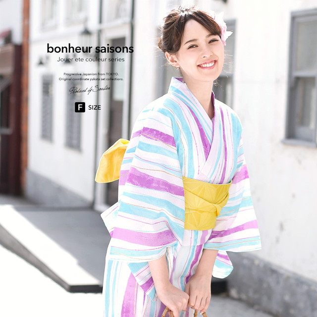 浴衣セット レディース レトロ 浴衣セット 大人 3点セット 白 ホワイト 水色 紫 黄色 よろけ縞 ラメ 綿 紅梅織 半幅帯 女性 ボヌールセゾン フリー