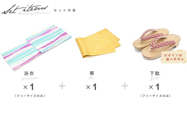 こちらの商品は、浴衣・帯・下駄の3点セットです。セット内容の一部変更や、それに伴う値引きは承っておりません。