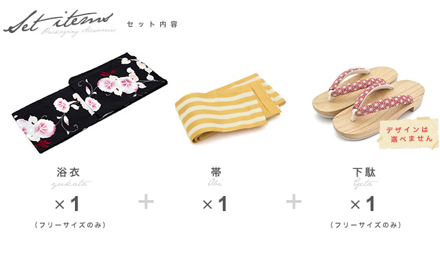 こちらの商品は、浴衣・帯・下駄の3点セットです。セット内容の一部変更や、それに伴う値引きは承っておりません。