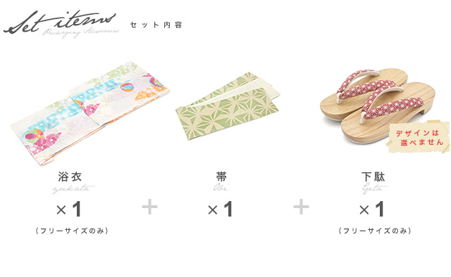 こちらの商品は、浴衣・帯・下駄の3点セットです。セット内容の一部変更や、それに伴う値引きは承っておりません。