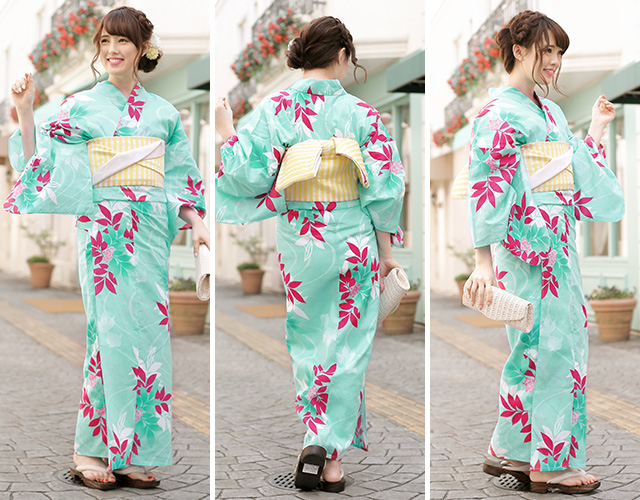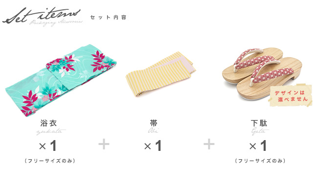 こちらの商品は、浴衣・帯・下駄の3点セットです。セット内容の一部変更や、それに伴う値引きは承っておりません。