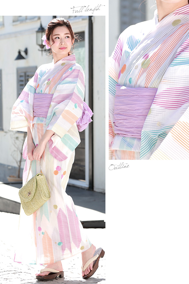 浴衣セット レディース レトロ 浴衣セット 大人 3点セット 白系 ホワイト カラフル オレンジ ピンク 紫 矢羽根 縞 水玉 ラメ 綿 紅梅織 兵児帯 女性 ボヌールセゾン フリー