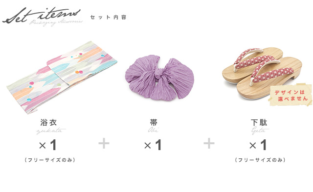 こちらの商品は、浴衣・帯・下駄の3点セットです。セット内容の一部変更や、それに伴う値引きは承っておりません。