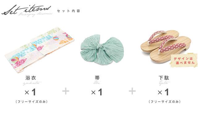 こちらの商品は、浴衣・帯・下駄の3点セットです。セット内容の一部変更や、それに伴う値引きは承っておりません。