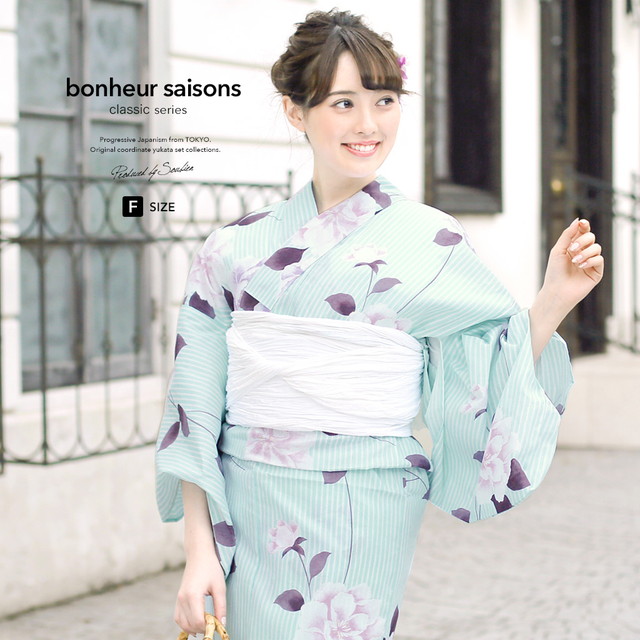 浴衣セット レディース レトロ 浴衣セット 大人 3点セット 水色 ブルー 白 牡丹 縞 ラメ 綿麻 兵児帯 女性 ボヌールセゾン フリー