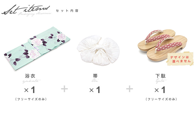 こちらの商品は、浴衣・帯・下駄の3点セットです。セット内容の一部変更や、それに伴う値引きは承っておりません。
