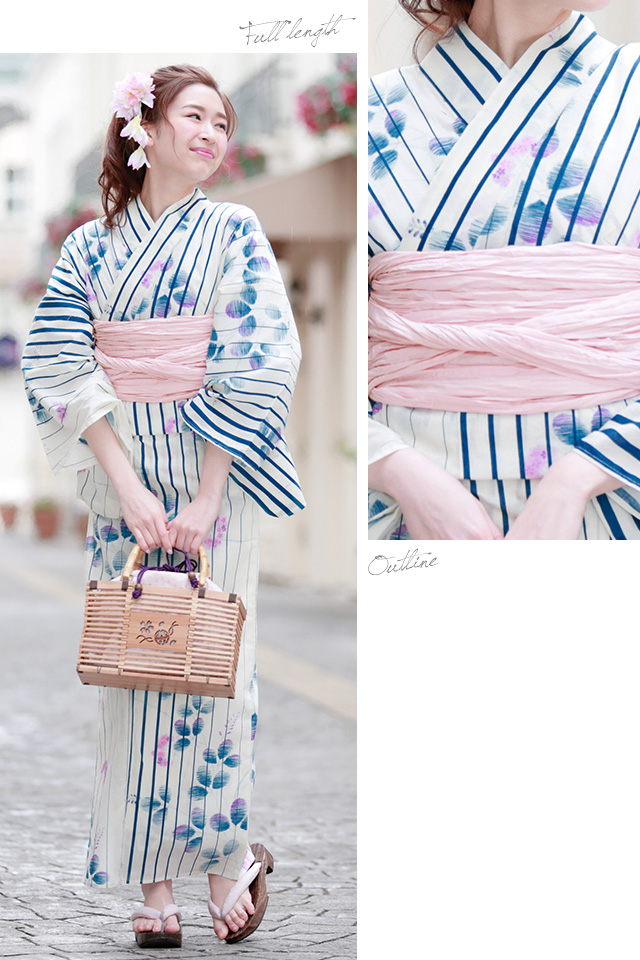 浴衣セット レディース レトロ 浴衣セット 大人 3点セット 白系 ホワイト 紺 ピンク 萩 縞 綿麻 兵児帯 女性 ボヌールセゾン フリー