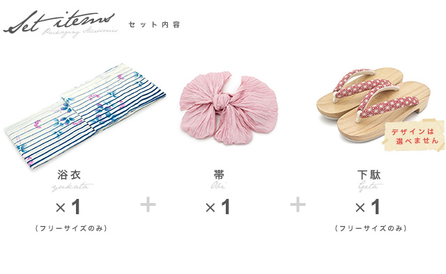 こちらの商品は、浴衣・帯・下駄の3点セットです。セット内容の一部変更や、それに伴う値引きは承っておりません。