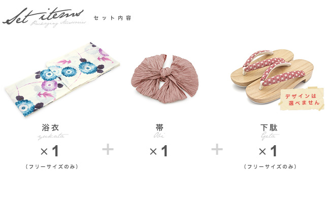 こちらの商品は、浴衣・帯・下駄の3点セットです。セット内容の一部変更や、それに伴う値引きは承っておりません。