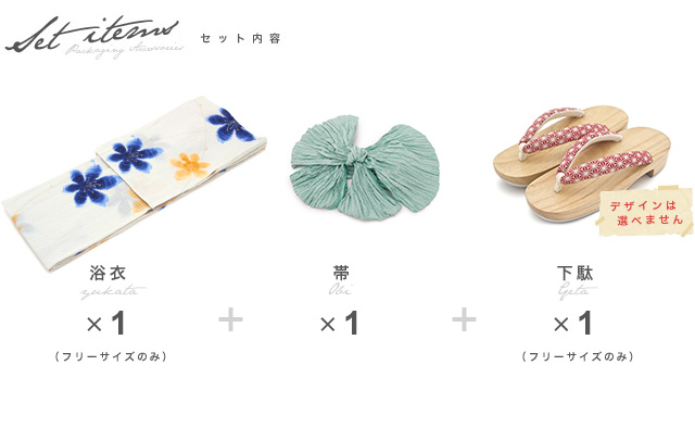 こちらの商品は、浴衣・帯・下駄の3点セットです。セット内容の一部変更や、それに伴う値引きは承っておりません。