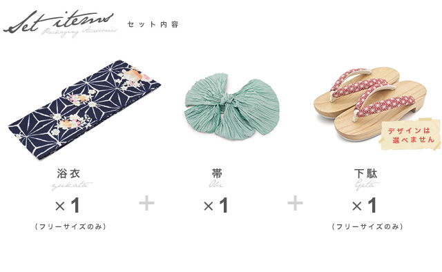こちらの商品は、浴衣・帯・下駄の3点セットです。セット内容の一部変更や、それに伴う値引きは承っておりません。