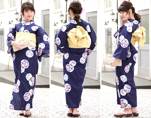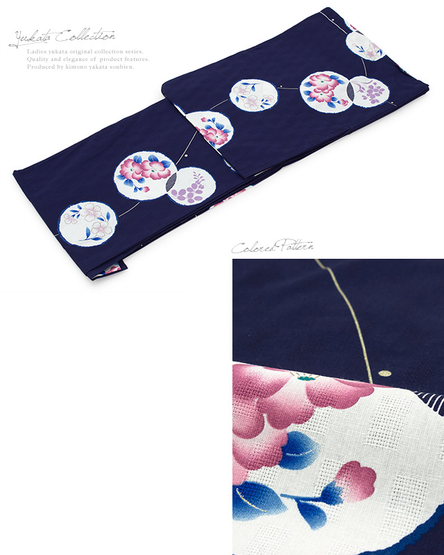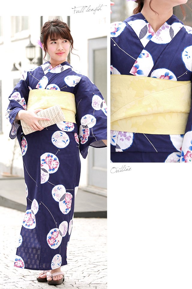 浴衣セット レディース レトロ 浴衣セット 大人 3点セット 紺 ネイビー 黄色 雪輪 椿 桜 藤 ラメ 綿 兵児帯 女性 ボヌールセゾン フリー