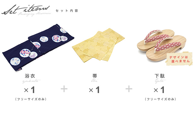 こちらの商品は、浴衣・帯・下駄の3点セットです。セット内容の一部変更や、それに伴う値引きは承っておりません。