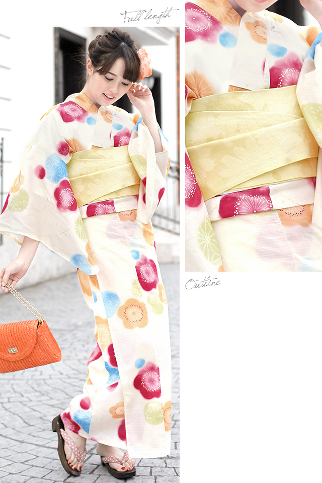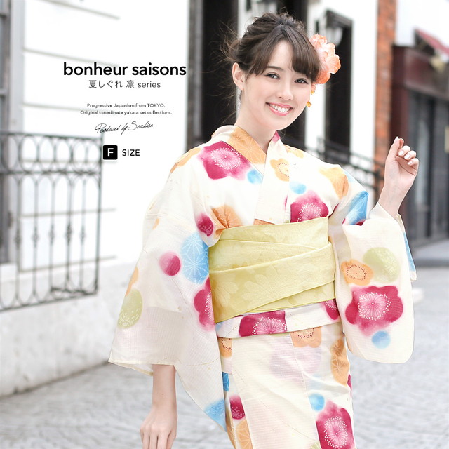 浴衣セット レディース レトロ 浴衣セット 大人 3点セット 白系 ホワイト クリーム カラフル 黄色 ぼかし 梅 花 麻の葉 ラメ 綿 紅梅織 兵児帯 女性 ボヌールセゾン フリー