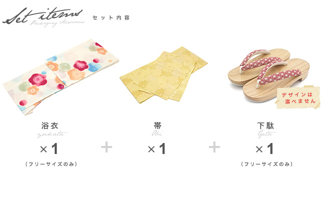 こちらの商品は、浴衣・帯・下駄の3点セットです。セット内容の一部変更や、それに伴う値引きは承っておりません。