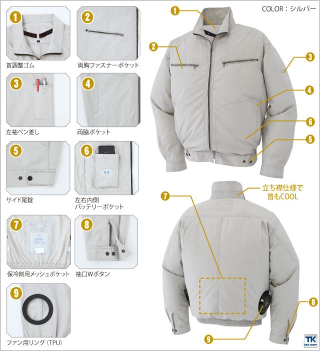 バッテリーポケット、袖口Wボタン、サイド尾錠、保冷材用メッシュポケット。