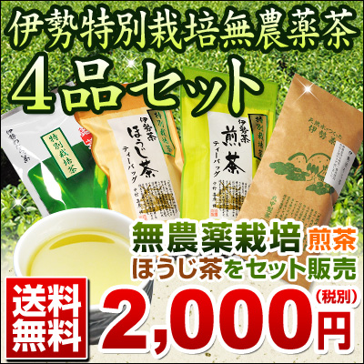 伊勢 丸中製茶 無農薬 無添加 茶 伊勢茶 緑茶 煎茶 ほうじ茶 ティーバッグ ティーパック お茶 茶葉 カテキン 日本茶 水出し 水だし 伊勢 特別栽培 無農薬茶 4品セット メール便 送料無料