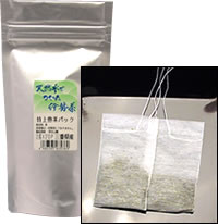 1番茶の粉のみ使用し、不織布のティーパックで包み、ひもを付けた商品です。
