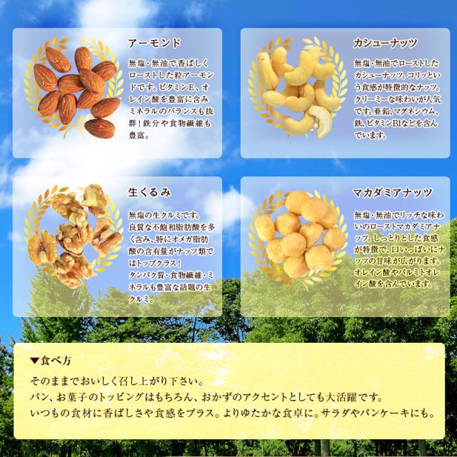 アーモンド(アメリカ産)、クルミ(アメリカ産)、カシューナッツ(インド産)、マカダミアナッツ(オーストラリア産)