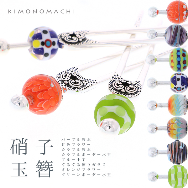 【Prices down】ガラス玉 かんざし「ブルー、虹色、オレンジ、グリーン、パープル」 髪飾り 簪 浴衣髪飾り 普段使いに