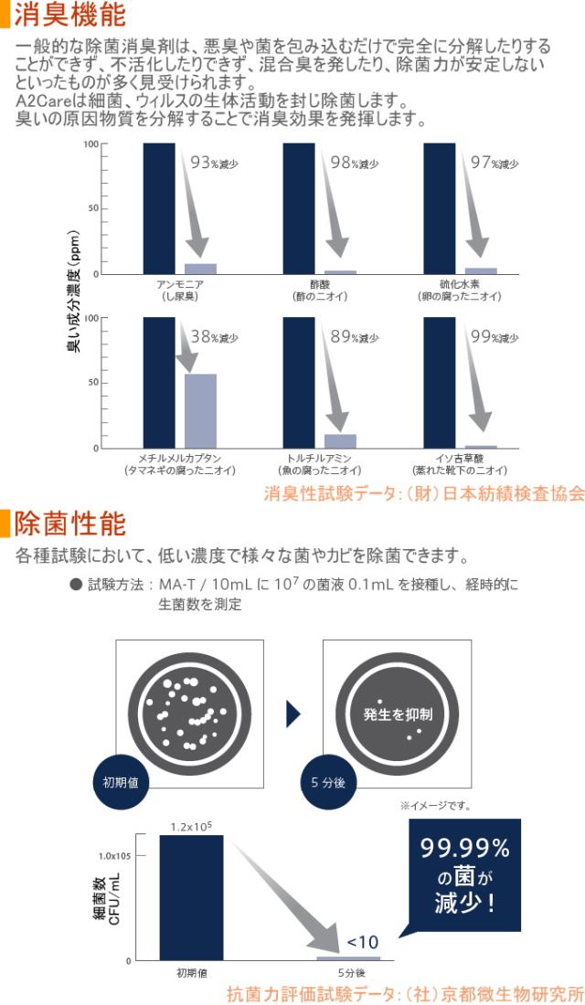 腐食性、刺激性がが水と同じレベルの高い安全性を保ちながら優れた除菌力と消臭効果を両立。
