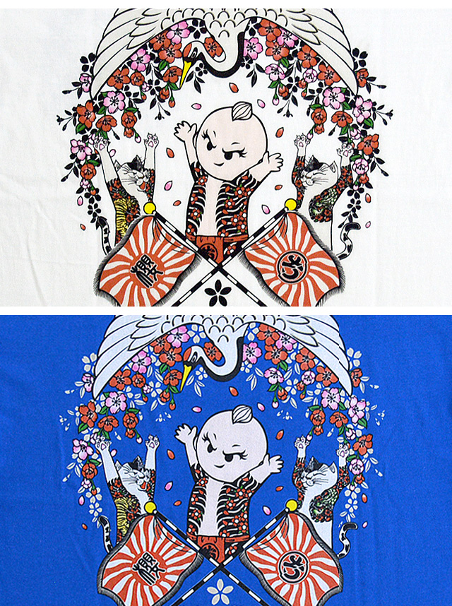 背中には、ちぎりちゃんとそのお仲間の猫の彫ぶち達が万歳をする姿がプリントしてあります。