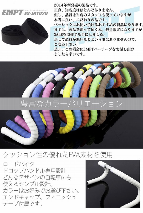 ■商品説明:ロードバイク ドロップハンドル専用設計 EVA素材バーテープ ES-JHT020 です。クッション製の高い、シンプルなバーテープになります。エンドキャップ、エンドテープ付属ですので、すぐに交換して頂けます。商品は、大手メーカーと同じ生産工場にて生産しておりますので、非常に高品質な商品です。大量生産により、リーズナブルな価格を実現しました。商品には、30日間満足保証が付いておりますので、安心してお買い求め下さい。