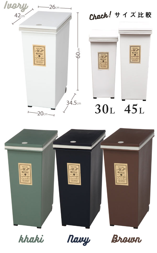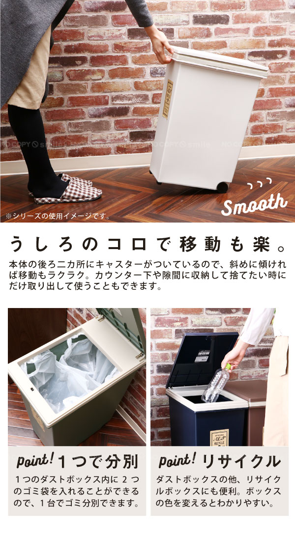 - 45Lでたっぷり入る。 フタがプッシュ式でゴミを捨てやすい。 底二箇所にコロコロも付いてるので簡単に動かせる。 落ち着いた綺麗な色でインテリアに合う。 ただし、フタが全開ではなく、斜め70...