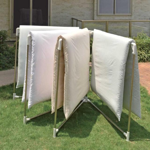 4枚まとめて干せる布団干し布団を4枚まとめて干せる、扇型の布団干しです。布団を干しても地面に接触しにくい高さ設計なので、布団を地面につけて汚してしまう心配を減らすことができます。