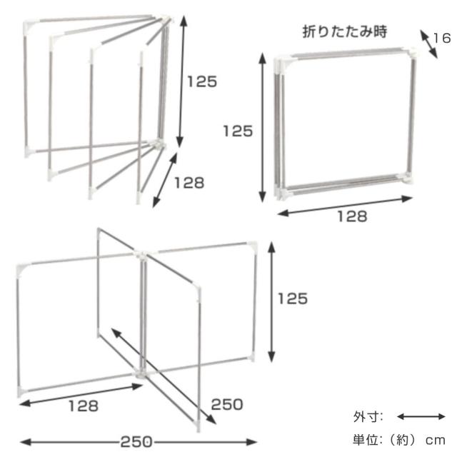 | サイズ | 約 幅250×奥行250×高さ125(cm) 使用時:約 幅250×奥行250×高さ125(開き方によって)(cm) 収納時:約 幅128×奥行16×高さ125(cm) |