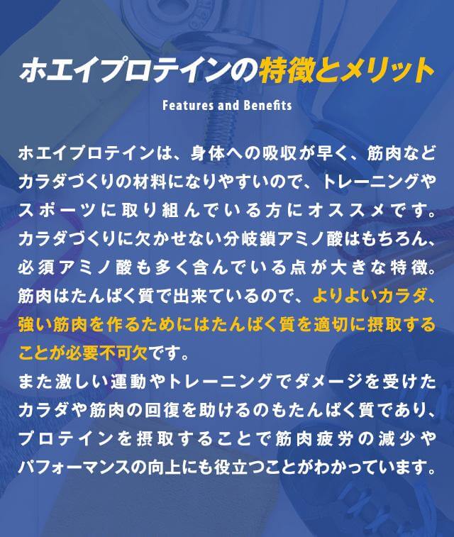 吸収の良い「ホエイプロテイン」を100%使用した乳化剤不使用シンプルなプロテインです。