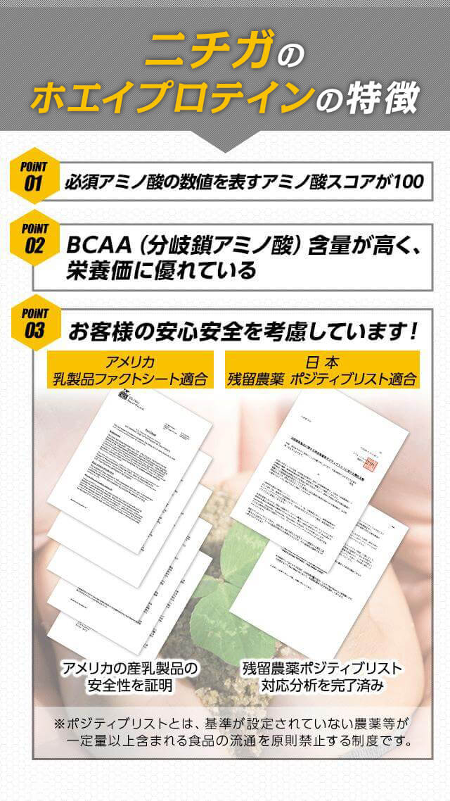 アミノ酸スコアが高く、BCAA含量も高く、栄養価に優れています。