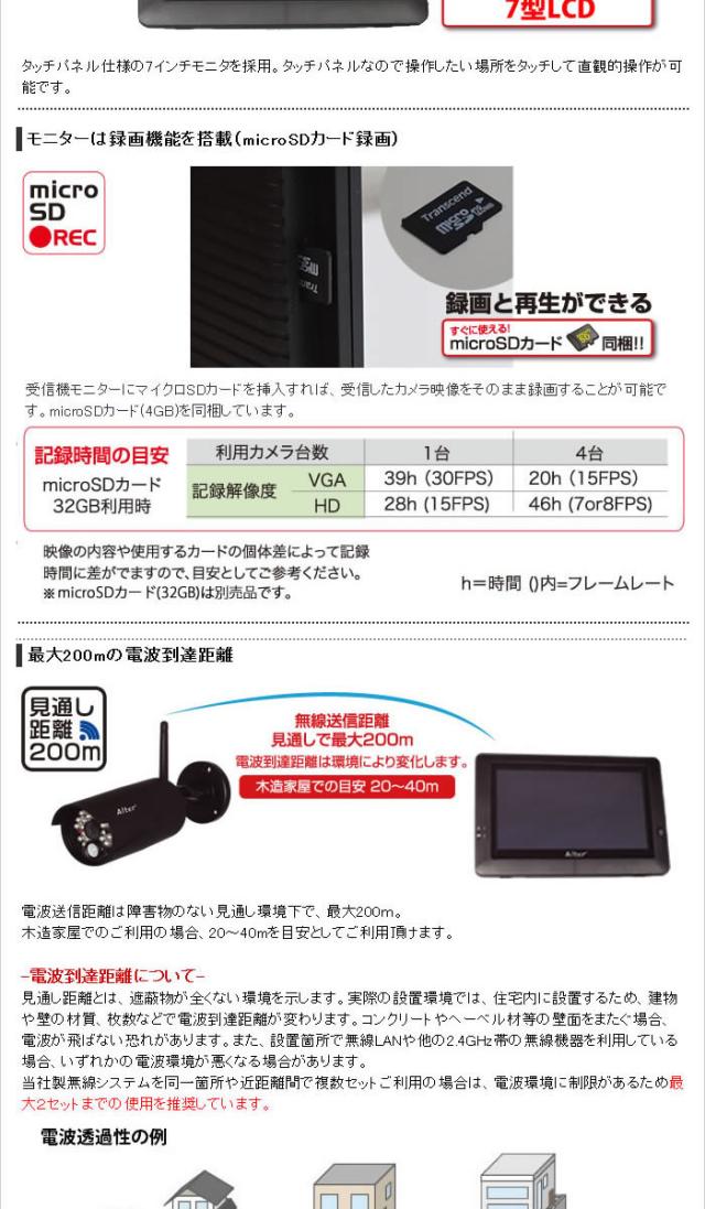 | セット内容 | 無線カメラ 受信機モニタ 無線アンテナ ACアダプター(DC9V 800mA) ACアダプター(DC5V 2A) LANケーブル 自己融着テープ 取付けネジセット microSDカード(4GB) 取扱説明書(保証書含む) |