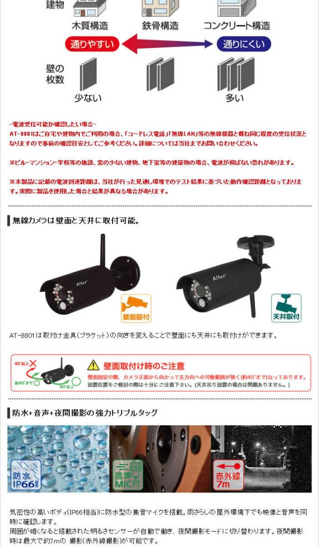 在庫あり 防犯カメラ 監視カメラ キャロットシステムズ Alter+ ハイビジョン無線カメラ&モニタセット AT-8801
