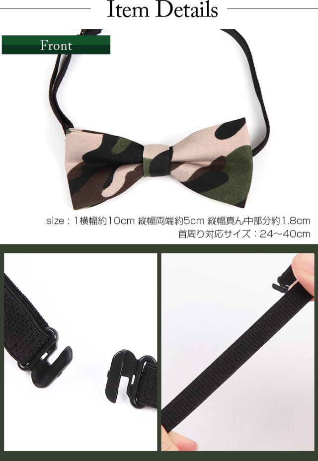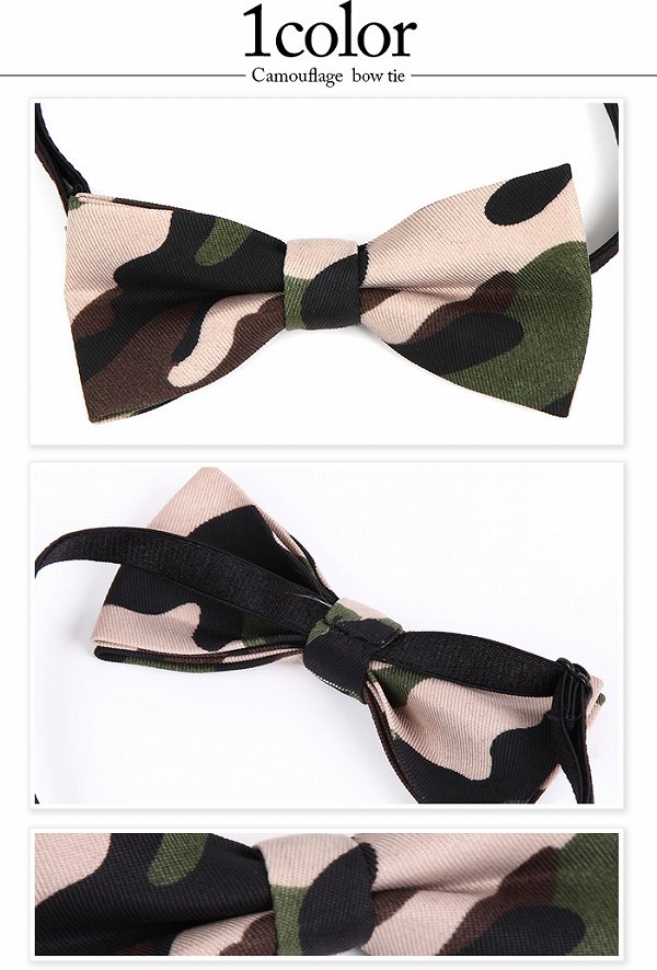 ■商品説明:ファッションのワンポイントに最適な迷彩柄の蝶ネクタイです。少し小さめの蝶ネクタイサイズですので、迷彩ですが、主張しすぎず、おしゃれに使える小物として最適です。