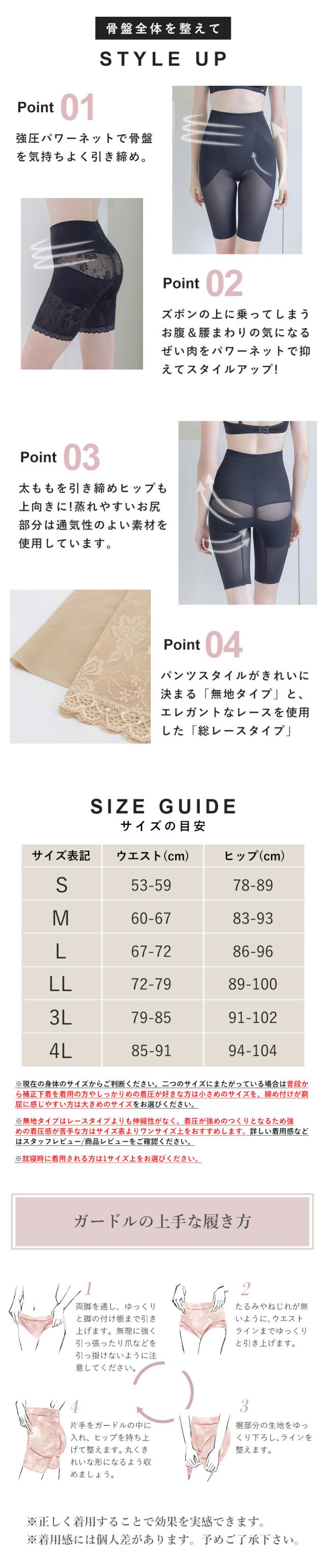 | S M L LL 3L 4L [サイズの目安] S (ウエスト55-61cm ヒップ78-89cm) M (ウエスト61-67cm ヒップ83-93cm) L (ウエスト67-73cm ヒップ86-96cm) LL (ウエスト73-79cm ヒップ89-99cm) 3L (ウエスト79-85cm ヒップ91-101cm) 4L (ウエスト85-91cm ヒップ94-104cm) |