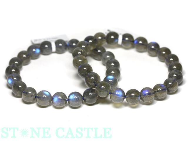 透明感のある薄いグレーの石に、ラブラドライト特有の青色がかった輝きが美しいブレスレットです。光を受けると3Aグレードのよりもブルーの輝きが強く、ほぼ全ての石にシラー効果が確認できます。夜空にかかるオーロラのような美しさを存分にご堪能いただけます。