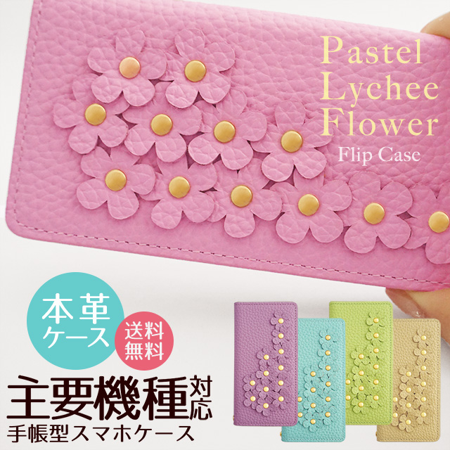 パステルカラーの本革をライチ(レイシ)パターンで加工したケースに同素材の花をデコレーションした手帳型ケース登場!左利き用もご用意しました。
