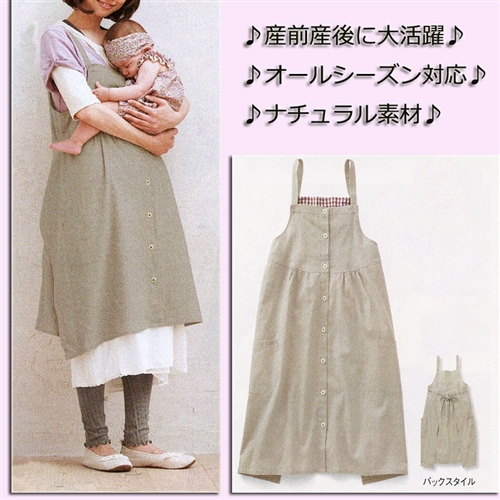 前:中央ボタン留め、左右ポケット、肩ひもボタン留め(調節可)