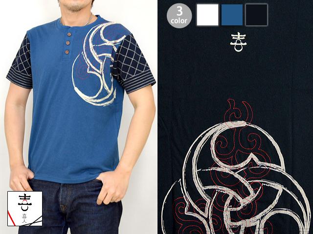 刺子巴ヘンリー半袖Tシャツ 喜人 和柄 和風 メンズ 家紋 KJ-71001