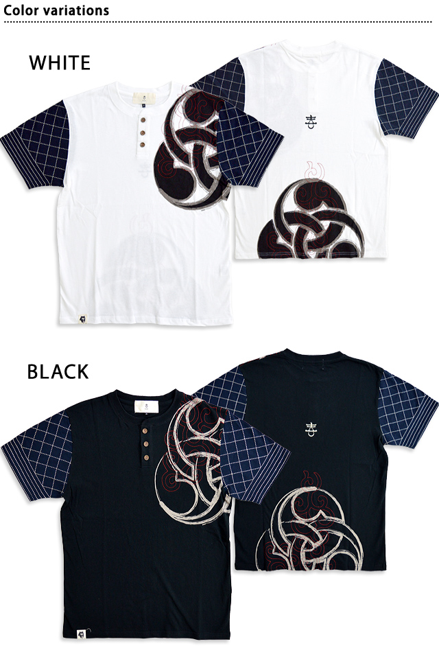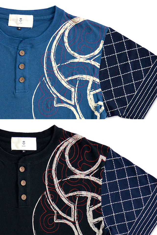 着た人、それを見た人が笑顔になれる、他にはないデザインを提供し続けている「喜人」さんから、「刺子巴ヘンリー半袖Tシャツ(KJ-71001)」のご紹介です。